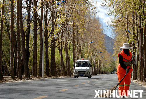 10月4日,一名环卫工人在拉萨鲁定北路清扫树叶。