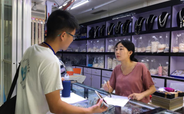 实践队队员正在向珍珠商家了解珍珠养殖情况 赵吉丽慧摄