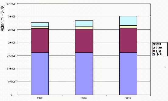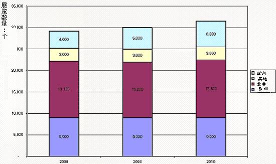另一家市场调查公司Business Strategies Group对2000年、2004年和2010年全球展览市场规模和展览组织者收入进行了统计和预测。预计到2010年,欧洲的展览会数目每年为9000个,与2000年和2004年持平;北美则略有上升,从2004年的13000个上升为2010年的13500个;亚洲的展览数目上升最多,从2000年的4000个,上升到2004年的5000个,2010年将达6000个(见图1)。与此同时,2000年到2010年,欧洲的展览组织者收入维持在165亿美元;北美2010年展览组织者收入则比2004年略增加10亿美元,将达110亿美元;而亚洲2010年展览组织者收入将提高最多,与2004年比,增加18亿美元,将达40亿美元(见图2)。
