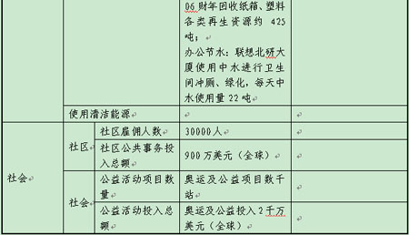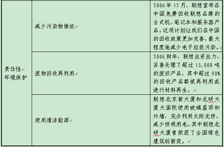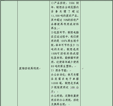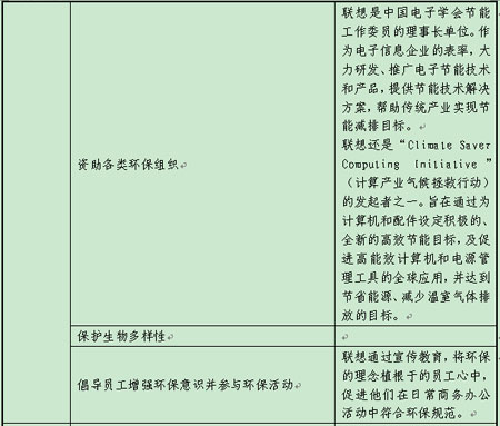 1.07年7月,联想和Intel、Google等公司,与世界野生动物基金会等NGO组织展开合作,组织了一个名为“拯救气候电脑节能行动”,这项行动旨在通过生产高能效的产品,以及实施强有力的电脑行业节能措施,应对全球的气候变暖问题。