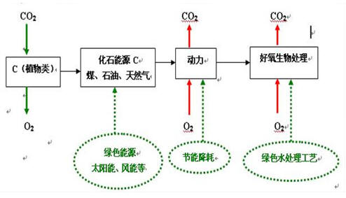显然,具有吸收CO2,放出O2功能的绿色植物类C,在转换为动力的过程中是逆向反应,即放出CO2,吸收O2,而生物处理也是这种逆向反应,这就是不可再生能源的使用方式。正是由于人类将越来越多的C源变成了CO2,从而导致了地球最大的灾难——气候变暖。这也正是绿色能源、节能降耗及绿色技术在当今备受重视的原因,我想,现在是提出来发展绿色水处理技术的时候了。