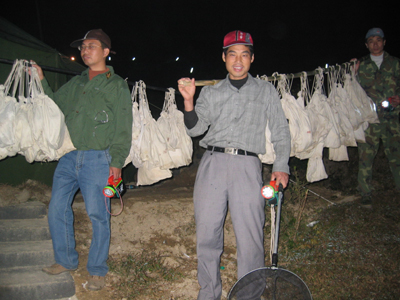 满载而归(白色袋子里装满了捕获后将环志的鸟) 大江网吉安讯 [通讯员肖放珍、罗宁毅]报道:每年秋天,数十万只候鸟从遂川县营盘圩千古鸟道迁徙到南方越冬;次年春天,气候转暖,候鸟们又会从遂川鸟道飞回北方,繁殖后代。年复一年,路线不改。自2002年以来,鸟类专家每年秋天如期来到营盘圩,进行鸟类环志,开展鸟类科研。今年遂川千古鸟道鸟类环志从9月7日起至今,共环志鸟类4733只,比2005年增加2962只;种类81种,新增种类10个。至此,5年来总环志鸟类8759只,种类达114种,其中2005年回收环志鸟4只,2006年回收1只。 在收集了大量的信息和资料,进行了深入的调查研究后,专家们终于破解了遂川千年鸟道的形成之谜。遂川千古鸟道是如何形成的?候鸟是怎样长途迁徙的?鸟是如何捕获的?鸟类环志又是怎样进行的?10月20—21日,带着种种疑问,笔者来到营盘圩鸟道,和环志人员同吃同住,感受——千年鸟道演绎鸟类迁徙的史诗。