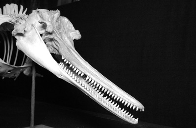 白暨豚的灭绝非“一日之功”,自上世纪80年代起,长江中常有白暨豚的尸体被发现,其中1984年发现的尸体竟达18具。它们有的是被轮船的螺旋桨打死的,有的是被滚钩、“迷魂阵”等非法渔具杀死的,也有遭受污染而病死的。图为白暨豚的骨骼标本。