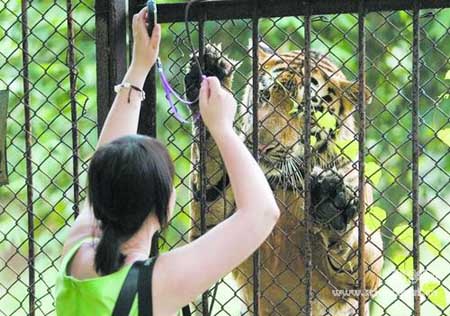 在熊虎山庄,一位游客用播放的手机音乐吸引了老虎好奇的目光。至今,熊虎山庄繁衍的第五代老虎已经和家畜没有太大的区别。