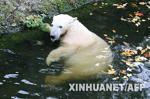 10月22日,在德国柏林动物园,北极熊克努特在水中玩耍。新华社/法新