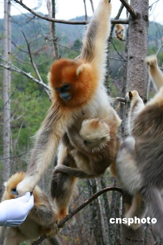 图为11月1日,拍摄于湖北省神农架大龙潭中与人和谐相处的金丝猴。据了解,在金丝猴的食谱中,植物种类多达172种。为让金丝猴安度寒冬,科研人员尝试着让金丝猴接受别的食物。经过5个月的磨合,苹果成了神农架金丝猴的美食。神农架给川金丝猴人工补食实验的成功,既是对川金丝猴进行保护的宝贵经验,也是中国珍稀野生动物保护与研究的一个重大突破。