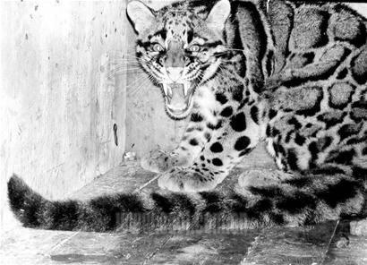 云豹别名龟纹豹、荷叶豹、柳叶豹,是国家一级保护动物。由于其全身灰黄色或淡褐黄色,体侧有云形暗灰色斑纹,宛如云朵,故名“云豹”。云豹具有猛兽的凶残性格和矫健的身体,既能上树猎食猴子和小鸟、又能下地捕捉鼠、野兔、小鹿等哺乳动物,有时还偷吃鸡、鸭等家禽。其1岁半性成熟,寿命可达17岁。由于目前云豹异常稀少,在中国濒危动物红皮书等级中,云豹被列为濒危(E)级。 (文/图 刘曾侯 记者 田富友 陈章采)