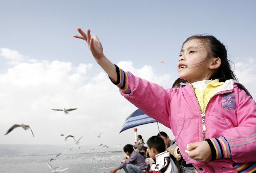 11月11日,一个女孩在滇池草海大堤喂食红嘴鸥。当日,飞抵昆明越冬的红嘴鸥已达数千只,这是生长在西伯利亚的红嘴鸥自1985年以来连续22年飞抵昆明越冬。新华社记者邹峥摄