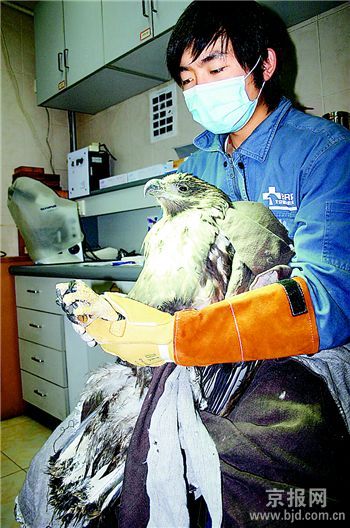 昨天(30日)上午,北京昌平区林业局将一只虚弱的大鸟送交北京猛禽救助中心救治。经鉴定,这是一只十分罕见的国家一级 保护鸟类白尾海雕的幼鸟。