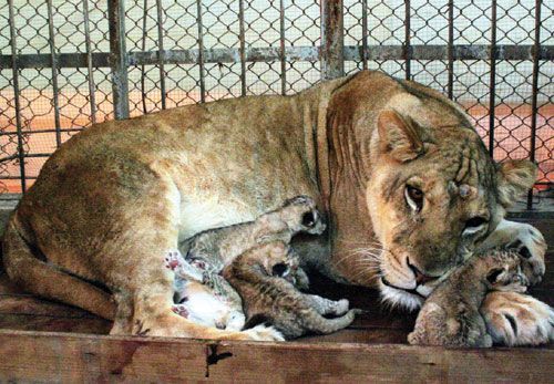 公老虎与母狮子交配生下四只虎狮兽