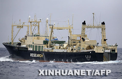 这张1月12日由绿色和平组织“埃斯佩兰萨”号船只提供的照片显示的是日本捕鲸船“日新丸”号行驶在南太平洋海域。绿色和平组织14日说,他们两天前将日本捕鲸船队的“鲸鱼加工”船成功逐出捕鲸区,阻挠了日本在南极洲附近海域的捕鲸活动。 新华社/法新