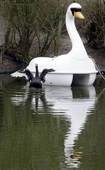 实际上,这只“白天鹅”是一个天鹅形的两人座游船,是池中各种动物形游船之一,其身材大概是彼得拉的5倍。或许是期待爱情的黑天鹅一时间昏了头,竟然将这条游船当成了自己求爱的对象。