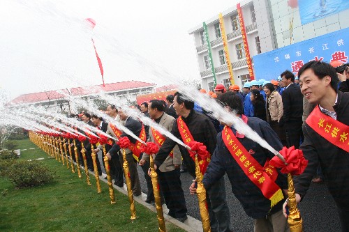 3月30日,市民代表、劳模代表和建设者代表在竣工通水典礼现场一起扳动开关,一股股长江水喷涌而出。当天,无锡市“长江供水工程”一期竣工通水,标志着无锡市建立的长江和太湖“双水源”安全供水格局初步形成,无锡市民开始喝上长江水。一期工程设计供水能力为每天40万吨。新华社发