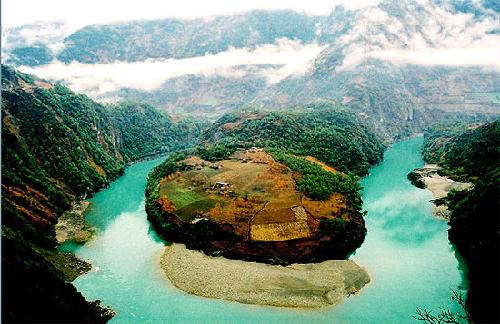 4、怒江第一湾 怒江出西藏进云南,一路南下,在丙中洛孜当村附近遇王菁悬崖绝壁阻挡,由原来的从北至南急转为东至西,西转300米后,又遇丹拉大陡坡阻挡,拐了一个180度的大弯后向东流去,形成罕见的“U”字形大弯。这里的江面宽阔,江水平静,你根本感觉不到眼前是愤怒的江水。碧罗雪山的一条小山梁被怒江环绕,恍若一座半岛。