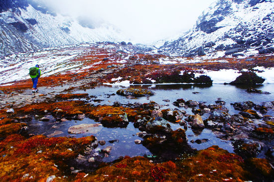 多雄拉山雪线,上面常年积雪,暴风雪在这里也开始大起来 精灵居住的秘境森林 从拉格出发去汗密大约28公里。主要是穿过一片亚热带原始森林和一小段蚂蟥区。墨脱的原始森林自然保护区大约有5.2万公顷,是中国保存得最好的一片原始森林。森林内有三千多种高等植物,被国家列为保护对象的珍稀植物就达几十种。 为了对付蚂蟥,临行前我做足了准备工作,小腿上的绷带绑得很严实,为了不给蚂蟥丝毫机会,我们还特意用宽大的透明胶布把脚踝缠上。另外还向老板要了一小袋食盐,用于对付蚂蟥。 经过大雨一夜的清洗,树林里散发着清香的泥土的气息,活泼可爱的藏香猪摇晃着小尾巴在草丛里觅食。小鸟在枝头用它那清脆的声音相互召唤,一切多么和谐。沿着一段泥泞的羊肠小道,我们钻进了原始森林的胸腔。参天的古树纵横交错,疯狂伸展着它们枝头的树叶遮蔽天日,常年雨水的浸润使这片树林充满了十足的野性和黑暗。千姿百态的千年古树挂满簇簇绿色的树茸,或者被寄生植物寄居生长。树枝和树干相互交错,好像在侧耳倾听着另一棵树的诉说。倒塌的朽木上铺满了绿色的地衣和蕨类植物。多么可贵呀!生是这片森林的一部分,死后依然为这片森林默默贡献着自己的躯体。奇特的植物、菌类和鲜花在这片肥沃的土壤上疯狂生长。乱石缝里,在沼泽上,朽木,土壤,一切可以生长的地方,都可以看到它们。这里就是植物的王国,精灵居住的地方。 不知不觉中,森林里的树叶坠下了大滴大滴的水滴,天空下起了雨,森林里漫起了水雾。泥浆沾满我的双腿,水雾遮挡了视线,四周水气漫溢升腾。潺潺溪水从山涧流下,汇集在我们行走的道路上。这条路让我开始明白“在到过墨脱的人面前不要言路”这句话了。这里的路颠覆了我对传统意义上路的理解。乌黑的腐土混杂着一簇簇死藤败叶,形成一个又一个死亡陷阱横在行走的道路上,让本来就是堆满乱石泥污的小道在雨水的浸泡下更加难行。人只能快速地踏着浸泡在沼泽里的木头和石块前进,一不小心就会陷进泥潭。我穿的塑胶鞋底子太薄,踩在石头上能完美地感觉石头的形状,脚底不时产生一道闪电般的疼。 快到下午了,肚子一直咕咕地叫。咬牙坚持穿过一片低矮的灌木林,道路开始往山上延伸,走到山腰眼前豁然开朗。往对面山上望去,云雾覆盖了整个山顶,谷雾就像一缕缕青烟在山腰飘荡。我们在一块开阔地坐下休息,背夫们从行囊里翻出一叠碗口大的面饼发给大家。我把面饼掰成两半,中间夹了些墨脱辣椒和自带的辣椒酱,做成了一个自制锅贴。虽然味道谈不上美味,但是对于饥饿得快要虚脱的人来说已经非常满足了。狼吞虎咽地填饱肚子后,身体立刻充满了能量,双腿顿时有劲儿起来。 一路往南继续前行,那是汗密的方向。雨一直不停地下,我们不知道穿越了多少公里森林和多少个山头,天空慢慢地暗下来,周围的树林悄悄变了样。阔叶植物越来越多,森林的颜色也越来越深。 这时,前面的人围作一团,不知道发生什么事。走近一看,原来一名背夫的脚踝淌着鲜血,两指捏着一只黑乎乎的像蚯蚓一样的东西四处蠕动。蚂蟥!我们已经进入了令人恐慌的蚂蟥区。我小心翼翼地踩着一块块光滑的黑色石块,蹚着小溪,忍着脚掌的巨痛一步步挪向汗密。天色已经漆黑,整个森林一片寂静,地面的情况也看不清楚,鞋子早已湿透。也不知道身上有没有蚂蟥,一切都管不上了,一心想着赶快冲出树林。 到达驿站已是晚上7点多钟。这座门巴风格的驿站就建在森林出口处。看到它我就深呼一口气,身上唯一的一股劲也卸了下来,直扑向屋子。还没有进门,就被女老板拦住,需要我们先确认身上没有蚂蟥才能入内。 检查完毕,进到简陋但充满温暖的屋子。女老板站在灶台前做饭,我一头瘫在长凳上不醒人事。直到听见“吃饭了”3个字,我才活过来。女老板做的饭菜很丰盛。一行人搬来一张大桌子,围在一起为今天的胜利干杯祝贺,也为明天的更艰险的路程相互打气加油。 TIPS 1. 解放胶鞋防滑效果不错,要保持鞋内干燥,如果脚起泡的话,用针挑破后挤出水,但不要撕破皮,好好休息一晚自然会好。 2. 过原始深林时,最好用登山杖或者木棍探路,以免踩进沼泽里。 第三天 路线:汗密—背崩 穿越地球最北的热带雨林 很难相信在西藏的冬季居然能够邂逅一直向往的热带雨林。但因为这里阴暗潮湿,温度适宜,是蚂蟥生长繁殖的乐园。因此它有个让人毛骨悚然的名字叫做蚂蟥山。 下了两天的雨后,天空放晴。今天天气不错。从驿站出来大约100多米,我们又开始钻进了一片树林里,越往深处树木越茂密。这时,只要你仔细看小腿附近的树叶,就一定会发现无数细长的蚂蟥一头吸附在叶尖,另一头伸直了躯干向路中间不停摆动,任何生命只要和它接触,都会被瞬间吸附在上面。当蚂蟥附在肌肤表层时,它头顶部的大吸盘张开,紧紧地吸住肌肤,人的血液就这么一点一滴地被吸入了它的体内,蚂蟥的躯体随之变大数十倍。如果人的皮肤不敏感,就不易察觉,因为蚂蟥吸血的整个过程不怎么痛。蚂蟥全身软绵无骨,发现蚂蟥千万不能硬拽,一拽,它的吸盘反而吸得更深,甚至可能钻进皮肤里。龙队长告诉我们过蚂蟥山时不能停留,更不能坐下休息。如果有蚂蟥爬上身体,就用盐巴撒在蚂蟥身上,它就会自动脱落。最容易受蚂蟥吸咬的躯体部位一般都是与草丛接触密切的