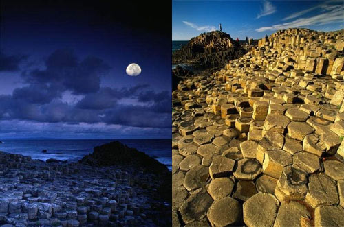 1986年被认定为世界遗产,位于北爱尔兰贝尔法斯特西北约80公里处大西洋的贾恩茨考斯韦海岸110米的断崖上,可见无数石柱突起。总长8公里的海岸线上呈正六角形,共计4万根的石柱由陆地向海里绵绵延伸。其景观有似巨人所造,固有“巨人古道”之美称。是6000万年前太古时代火山喷发后熔岩冷却凝固而形成的。如此排列有序的石柱,不禁让人怀疑不是天然雕琢而是人工有意堆积而成的。