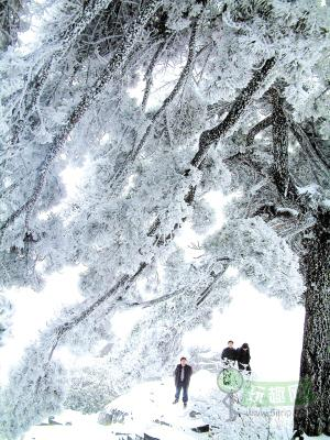当瑞雪纷飞,山峦被洁白的冰雪笼罩时,满山松杉翠竹冠叶上积雪堆垒,万树如玉砌。遇上冻雨,满山树枝又仿佛变成毛玻璃,晶莹透明。山崖间,树枝下,一条条象钟乳一样的冰柱,一簇簇似玉琢银雕的晶簇,一棵棵如银枝玉叶的珊瑚,象一根根水晶倒挂,一座座冰塔高耸,仿若一片琉璃世界。