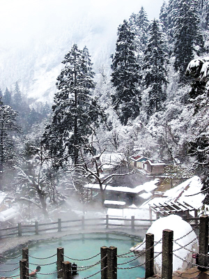 冬游海螺沟,正是看冰川的最佳时节。海螺沟的冰川容易攀登,就算是年逾古稀的老人,也可攀登到冰塔林、冰阶梯、冰川洞、冰石蘑菇、冰桥等,亲身体验乐趣。另外,冬天的海螺沟拥有可与加拿大国家冰川公园比拟的大冰瀑布。更妙的是,海螺沟有着大流量的温泉、热泉甚至沸泉。冬季到此,一边泡温泉一边赏雪山,在热呼呼的天然温泉里欣赏雪花漫天飞舞的奇景,是何其浪漫。
