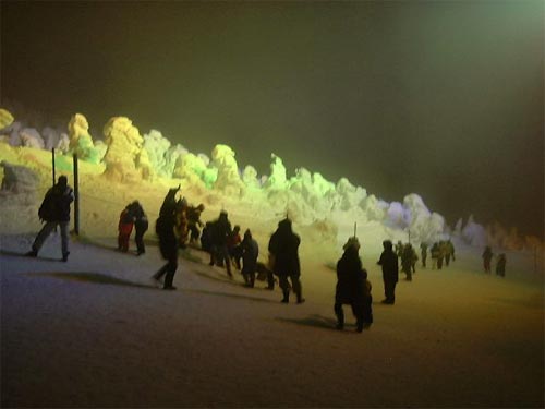 从仙台驱车一个小时左右,就到了宫城县藏王山脉边上的雪公园,冬天来此可欣赏到树冰奇观。树冰是在青森冷杉的树枝上附着细碎的结冰积雪而形成,是此地区独特的冬季气候所创造出来的天然艺术,也是藏王山脉的象征。乘坐着备有暖气的最新锐的特别雪车行驶在雄大的树挂雪原上,舒适地欣赏到藏王山顶附近为止的树挂美景。天气晴朗时,可以360度环视树挂雪原,体验梦幻般的世界,而且可以一望眼前太平洋的绝色美景。此处设有滑雪场,山麓还有著名温泉,在体验完冬天的滑雪运动之后享受温泉,可以说是日本东北冬天特有的享受。