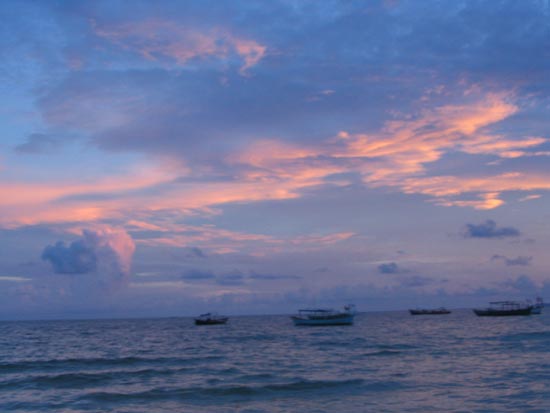 由于西哈努克港位于柬埔寨的西南部,因此,无法看到海上日出,但优美如画的日落足以弥补没有日出的遗憾,是无论如何都不能错过的风景,伴随着日落,海面上的波涛逐渐增大,远处星星点点的渔火渐渐显现,像是幅移动的风景画。