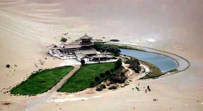 鸣沙山,因沙动有声而得名。古称“沙角山”、“神沙山”。山有流沙积聚而成,东西长约40公里,南北宽约20公里,最高海拔1715米。其山沙垄相衔,峰如刀刃,远看连绵起伏入虬龙蜿蜒,又似大海中的波涛涌来荡去,甚为壮观。沙粉红、黄、绿、白、黑五色,晶莹闪光不沾一尘。如遇摩擦振动,便会殷殷发声,轻若丝竹,重如雷鸣。故“沙岭晴鸣”为敦煌“八景”之一。 月牙泉处于鸣沙山环抱之中,因其形酷似一弯新月而得名。古称“沙井”,又名“药泉”,一度讹传“渥洼池”,清代正名“月牙泉”。面积0.88公顷,平均水深3米左右,水质甘冽,清澈如镜。千百年来沙山环泉而不被掩埋,地处干旱沙漠而泉水不浊不涸,实数罕见。泉内星草含芒、铁鱼鼓浪,山色水光相映成趣,风光十分优美。