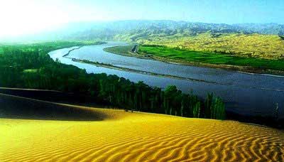 特色之二是沙山北面是浩瀚无垠的腾格里沙漠。而沙山南面则是一片郁郁葱葱的沙漠绿洲。游人既可以在这里观赏大沙漠的景色,眺望包兰铁路如一条绿龙伸向远方;又可以骑骆驼在沙漠上走走,进行沙漠冲浪,或照张相片,领略一下沙漠行旅的味道。 特色之三是乘古老的渡河工具羊皮筏,在滔滔黄河之中,渡向彼岸。这种羊皮筏俗称“排子”,是将山羊割去头蹄,然后将囫囵脱下的羊皮扎口,用时以嘴吹气,使之鼓起,十几个“浑脱”制成的“排子”,一个人就能扛起,非常轻便。游人坐在“排子”上,筏工用桨划筏前进,非常有趣。