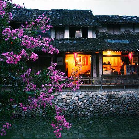 那天傍晚,我们又去了丽水街,老天体贴地突然下起雨来,我们在长廊里走来走去,走累就坐下,快乐得象水里的鸭子,看着长廊上居民悠闲地生火做饭,各忙生计,一排灯笼慢慢亮起来了,雨也慢慢停了,雨后的丽水街笼罩着淡淡的水气和忧郁。人们吃罢晚饭,纷纷聚集到街尾的千年老树下面,乘凉闲聊,孩子们快乐地在石桥上跑来跑去,桥边的戏台上,也开始唱起咿唔的越剧来,吸引了许多居民摇头晃脑的伴和。