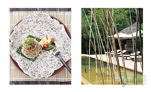 在两人高编得密密的蒿草篱笆后,在星空下洗澡,水声传得很远,而电瓶车、步行去餐厅的邻居说笑的声音都能听得清楚。我穿上简单的纱笼,骑上自行车赴主厨的约会了。这个越南主厨很得意能来此工作。“管你在四季还是索非特,主厨对菜式自由发挥的余地不多。但在这里,我随时可以变更餐单,原料在我们的有机菜园栽种,菜谱里也有我的独家秘笈。”