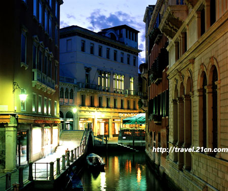 穿过圣马可广场,在街角的小码头上,花上20欧元便可搭乘小船贡多拉。贡多拉是威尼斯的一大特色,据说制作严格而又讲究:长11米,宽近1米半,以栎木板为材料,用黑漆涂抹七遍始成。坐满六人,加船夫一人。古时候威尼斯日常生活的情景依稀浮现出来。没有了白日里的喧嚣和浮躁,坐上小船贡多拉,你才会有望一望水面的心情。灯火寥落,星光却拥有其他城市无法比拟的灿烂,满天星斗就在你眼皮底下闪耀,天空似乎是倒过来了,这种美丽让人窒息。若你是和恋人同游威尼斯,别忘了,在贡多拉穿过一座连接两岸楼房的古桥--叹息桥时,相拥夜吻。据说在很久以前,这座桥的一面是审讯犯人的地方,不过到这里受审的犯人,都不会再活着出去,因为他们都是被判了无期徒刑或者死刑的犯人。行刑之前,他们走的最后一条路就是这座桥,因为要过桥到另一头的监狱行刑。过桥的时候,看着即将离去的世界,犯人会后悔的叹息,久而久之,连桥都受了感染,叫做叹息桥。每年都会有无数的恋人千里迢迢地跑到这座桥上来接吻,传说在叹息桥上接吻,爱情便会永生永世。