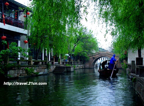 按她的指引,我沿古镇河道边青青的石板路漫步--既不会迷路,又能到达我想去的幽静所在。我本以为会立刻见到一个幽幽暗暗的周庄,但映入眼帘的,却是一排排齐整的酒楼红灯笼,人影翩然。茶楼里闲聊的人们和丝竹声声颇有些不合。商人的叫卖声响起在附近的小桥边上,灯红酒绿让我忽然有一种怪怪的感觉:我不是被女人的优雅迷惑了吧,为何仍是不肯回头?