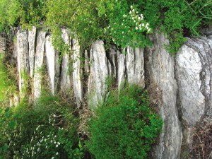 在中崄平台上探寻了几回,才找到通向上崄的小道。上崄的平台不大,一处小庵依石壁而建。不远是一洞窟,洞口颇大,因洞口向阳,被当地人称作朝阳洞。据老乡说,此洞原有千手千眼佛,“文革”中被毁。