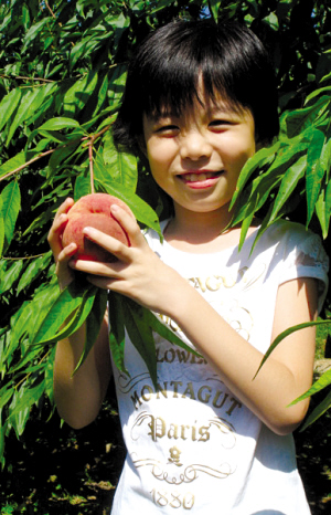 园子分上下东西两片,总面积500多亩,放眼望去,壮实的果树枝繁叶茂,仿佛一片果树的海洋。我们从入园口挎了两个采摘的篮子,下了一个缓坡便看见园子的木栅门,一条小路动情地伸向果园深处,仿佛是铺向丰收的金色地毯,,同行的朋友兴奋地叫了起来:“我闻到桃的香气了!”据采摘园的工作人员小刘介绍,现在可供游人采摘的主要有艳红24号和33号桃,个头很大,而且脆甜可口。这些天每到周末平均都有500人来果园采摘,有的跟团来,一下子就30多人同时入园,很热闹。