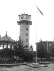 沿江往南一座高塔,便是名闻遐迩的中国最北哨所。哨所由瞭望塔、中俄会晤站、士兵营房组成。我们在醒目的“军事禁区”标牌前止步,不敢擅 入。后经陪同领导的联系,得以破例入内上塔,一睹北国边防风光。