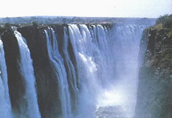赞比西河是南部非洲著名的国际河流,也是津巴布韦与赞比亚两国的界河。维多利亚瀑布位于这段界河的西端、赞比亚河中游,也称"莫西奥图尼亚"瀑布。瀑布区绵延97公里,是世界上最大的瀑布。作为津巴布韦与赞比亚两国的共同财富,维多利亚瀑布已于1989年被联合国教科文组织列入世界遗产名录。