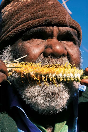 在乌鲁鲁土著文化中心(Aboriginal Cultural Center),土著首领介绍曾经作为美食的植物花朵。