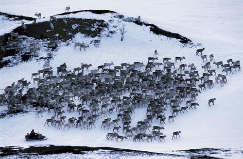 牧民们这样做有他们的道理,一路上他们要驱赶着如潮水般的驯鹿群。冷静地观察和引导是极其重要的——牧民们绝对不能引起驯鹿们的骚动。从远古时代起,发出迁徙信号的都是雌性驯鹿,而那些随着春天一起降生的小驯鹿则为这场迁徙平添了不少危难。出于本能,这些驯鹿将逆着河流一路北上,最终到达北冰洋附近。在那里,它们将找到更多的食物以及有利于产仔的条件。