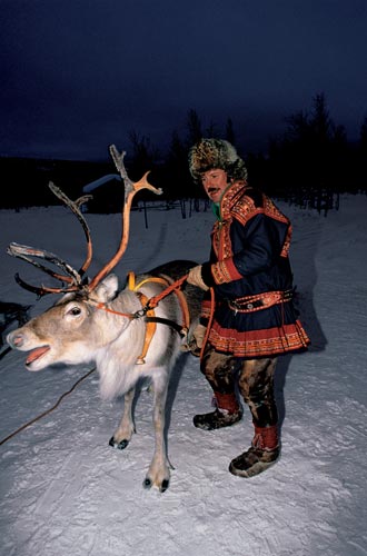 渐渐地,我们身后传来了一阵悦耳的铃铛声。一头长着巨大犄角的驯鹿拖着一块宽大的雪橇从我们身边跑过。大家的注意力立即被这充满圣诞色彩的景致吸引住了。和狗拉雪橇相比,驯鹿拉雪橇显然更为安全。