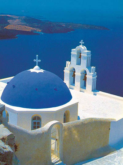 从山顶眺望,白色的房屋如朵朵盛开的水仙,海边蓝顶白墙的东正教教堂如同童话中的先仙境,而碧蓝的海水正同湛蓝的天空融为深邃的一体,形成美妙的希腊式景象。