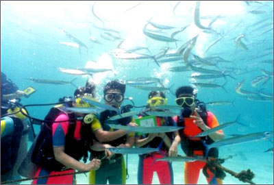 塞班是潜水者的天堂,有超过18个潜水点,最出名的当属蓝洞(TheGrotto)。它曾被《潜水人》(DiverMagazine)杂志评为全球第二驰名洞穴潜点,只对有国际潜水执照者开放。潜水路线为:从地面的天坑下到充满海水的洞穴口,洞口呈"V"字型,潜向海底,再潜向外海海面。据曾经潜过蓝洞的导游说,在这个水下洞穴里,住着一家三口黑脊鲨,每一个潜水者都会温柔地从它们身边游过,前往光怪陆离的海底洞穴世界。