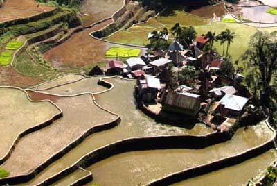 在层次分明的梯田之中,还存在着数座原住民村落,他们居住在高架起的草屋里,除了避免毒蛇野兽的侵袭之外,也可饲养家畜。在草屋的入口,原住民会挂上数头动物的头骨作为装饰,也显示自己在族中的地位。