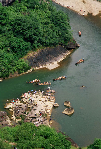 武夷山九曲溪发源于华东大陆最高峰——武夷山脉主峰黄岗山,全长60多公里,由西向东穿过武夷山景区,盈盈一水,折为九曲,所以得名。