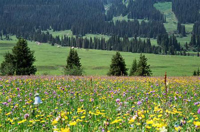 果子沟果子沟与塞里木湖相连,这里山路盘旋、云杉密布,天空大朵的白云仿佛堆积在树梢上,透过云隙闪烁着点点明亮的蓝,灿烂的金。据说在山谷下树丛里长了许多的山杏、野果和药材,我们没有看见,却在途中发现了一片山花烂漫的草甸,那数不尽的山花、不知名的山花,迎着阳光尽情地绽放,穿梭不息的蜜蜂、蝴蝶飞舞翩翩,令人销魂之余也谋杀了不少的菲林。