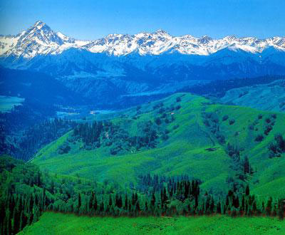 从尼勒克县往唐布拉草原的一路上,两边都是青翠碧绿的草原和山峦,山上长满了挺拔笔直的松树,那一排排、一列列的松树仿佛是战阵的士兵,又像是一支支箭镞,整齐划一。