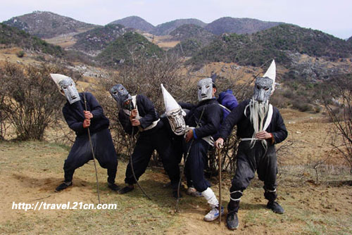 以上演员,均以白布带缠腿,以白布带搭肩交叉于腰间,穿青色或黑色的衣服,其义象征人类初期人是裸体。