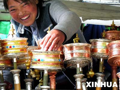 | 4月24日,藏族女孩白玛在拉萨八廓街摆放待售的工艺品。新华社记者 普布扎西摄 |