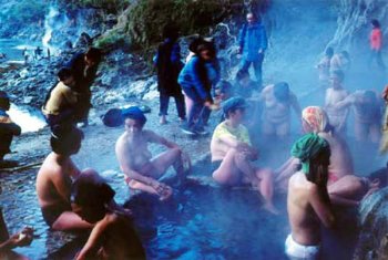 男女共浴是摩梭人的古老习俗,人们借着洗温泉的机会娶亲访友。男人们大都不露声色地脱去衣裤,走进温泉水塘。女人们不像男人那样潇洒。她们通常先在水边脱去上衣,然后一边走入水中,一边把裙子往上提,动作缓慢而优雅,直到美丽的身影淹没在水中……男女青年一边互相擦背,一边开着玩笑。在温泉水中,人们从不会产生占有的“邪念”。