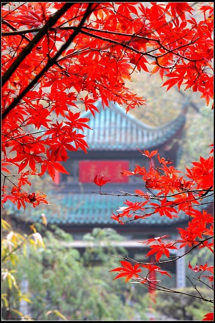 从岳麓山山脚沿着小路往山顶攀登,红叶不时映入眼帘。片片枫叶像一支支火炬,把整个季节烧成了红红的一片。爱晚亭附近是观赏枫叶的最佳所在,在红叶的映衬下,爱晚亭出落得更加迷人。亭边,红得通透和醇厚的枫叶缀满了树枝,热热烈烈,像一个活泼的少女,与枫树粗壮而古朴的树干相映成趣,引得一批又一批观光的人纷至沓来。当微风吹过,片片枫叶飘落时,不少恋人在枫树前留影。