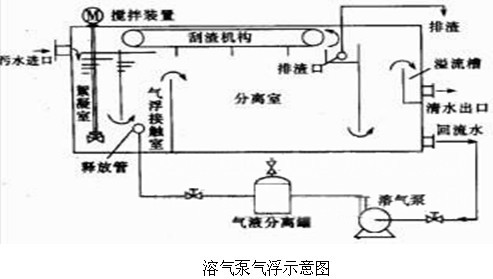 主要功能:气浮法是在水中通入或产生大量的微小气泡,使悬浮颗粒、胶体物质附着在其表面上,造成密度小于水的状态,利用浮力原理使它浮在水面,从而获得固、液分离的目的。溶气泵采用涡流泵或气液多相泵,其原理是在泵的入口处空气与水一起进入泵壳内,高速转动的叶轮将吸入的空气多次切割成小气泡,小气泡在泵内的高压环境下迅速溶解于水中,形成溶气水然后进入气浮池完成气浮过程。溶气泵产生的气泡直径一般在20~40μm,吸入空气最大溶解度达到100%,溶气水中最大含气量达到30%,泵的性能在流量变化和气量波动时十分稳定,为泵的调节和气浮工艺的控制提供了极好的操作条件。示意图如下: