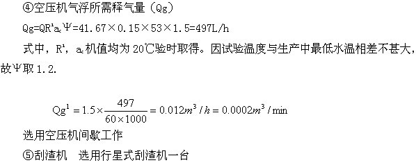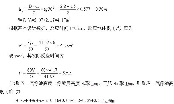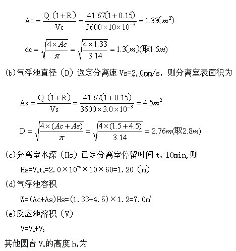 ①反应一气浮池,采用旋流式圆台形反应池及立式气浮池。 (a)气浮池接触室直径(dc)已定接触室上升速度Vc=10mm/s,则接触室表面积为: