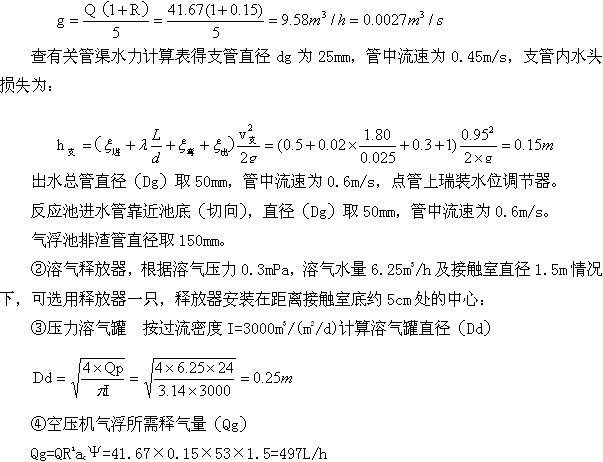 设计数据取值如下: 处理水量Q=41.67m3/h 分离室停留时间取10min 反应时间t=6min 溶气水量与处理水量的比值R=15% 接触室上升流速(Vc)取10mm/s 溶气压力采用0.3mPa 气浮分离速度Vs取2.0mm/s 设计计算: